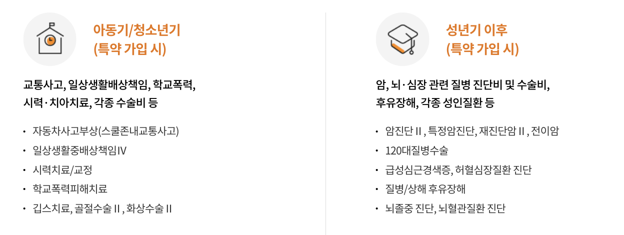 ✔️ 아이들이 뛰어놀다가 다치는 일이 많은 만큼, 골절/수술비 특약은 필수입니다.