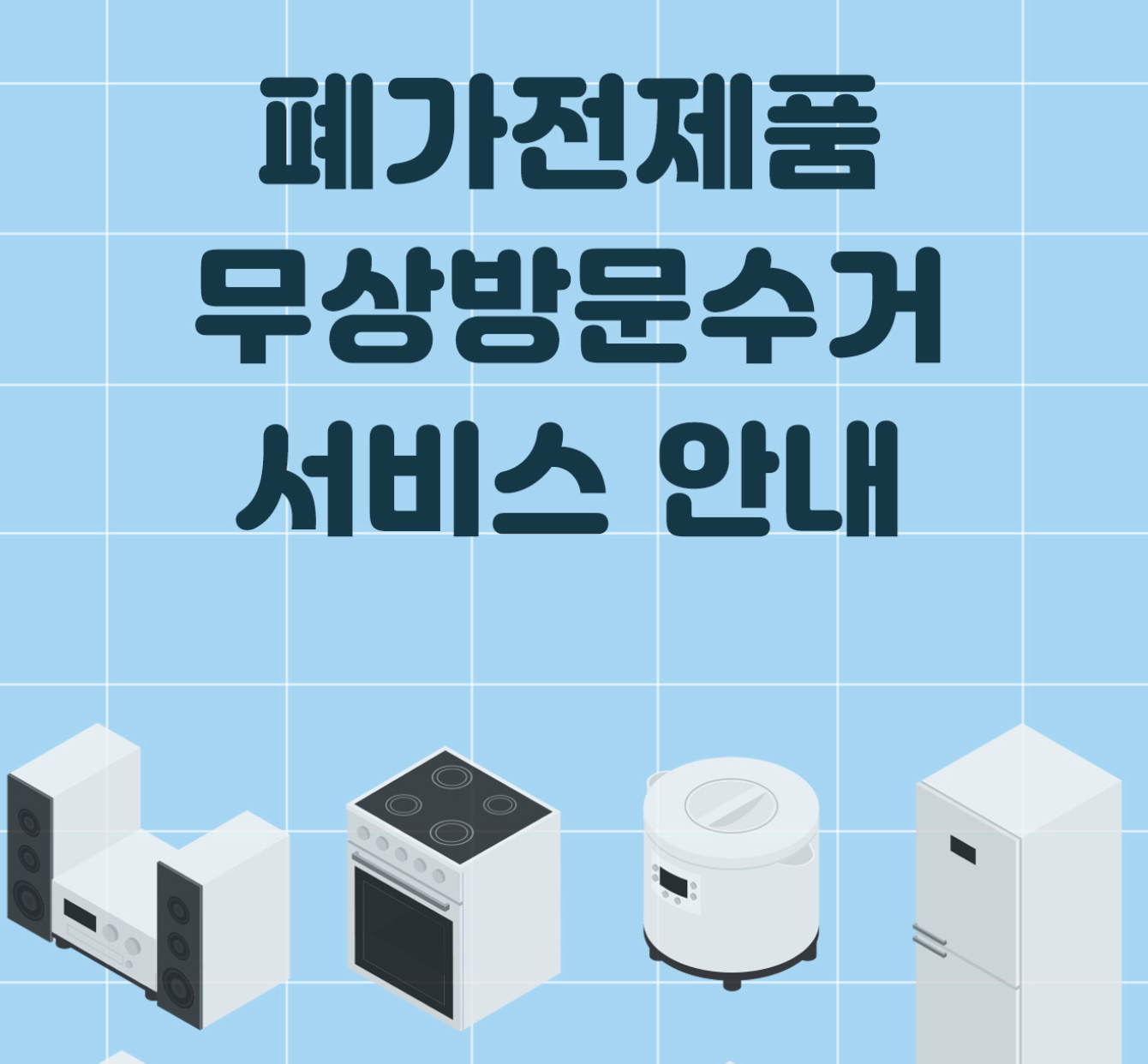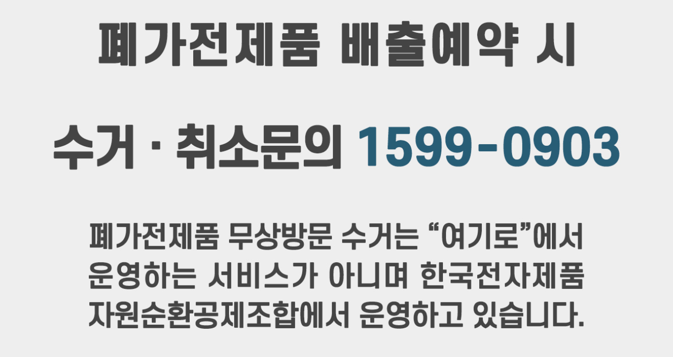 - 폐가전 무상 방문 수거: 한국전자제품자원순환공제조합에서는 폐가전제품 무상 방문 수거 서비스를 제공하고 있습니다. 홈페이지나 콜센터(1599-0903)를 통해 예약하면 원하는 날짜에 수거 기사님이 직접 방문하여 수거해 갑니다. 단, 소형가전제품은 5개 이상 모아서 신청해야 하며, 단독 신청은 불가능합니다.