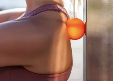 - 벽에 등을 대고 서서 마사지 볼을 승모근 부위에 대고 압박합니다.